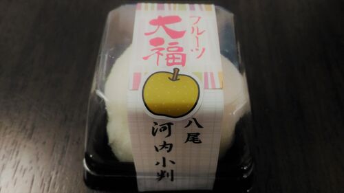 八尾河内小判 フルーツ大福梨(白あん) 基本情報 重量:57g参考価格:182円グラム単価:3.19円/g製造者:河内小判購入場所:河内小判お得度:★★★★ パッケージ 小ぶりのプラケースに入っています。ラベルは帯状になっています。フルーツ部分はシールですね…